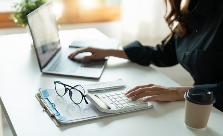 Person sitzt vor Laptop mit Handy und Kreditkarte in der Hand.